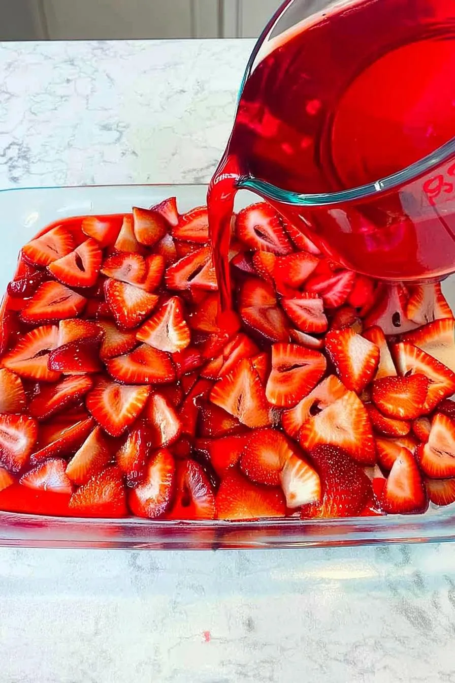 - Combine 2 (3 oz) packets strawberry Jell-O with 2 cups boiling water, stirring until fully dissolved and offering fragrant steam. Add 4 cups sliced strawberries and 1 cup cold water, then chill in the fridge for about 20–30 minutes until slightly thickened—not fully firm—to avoid fruit sinking.