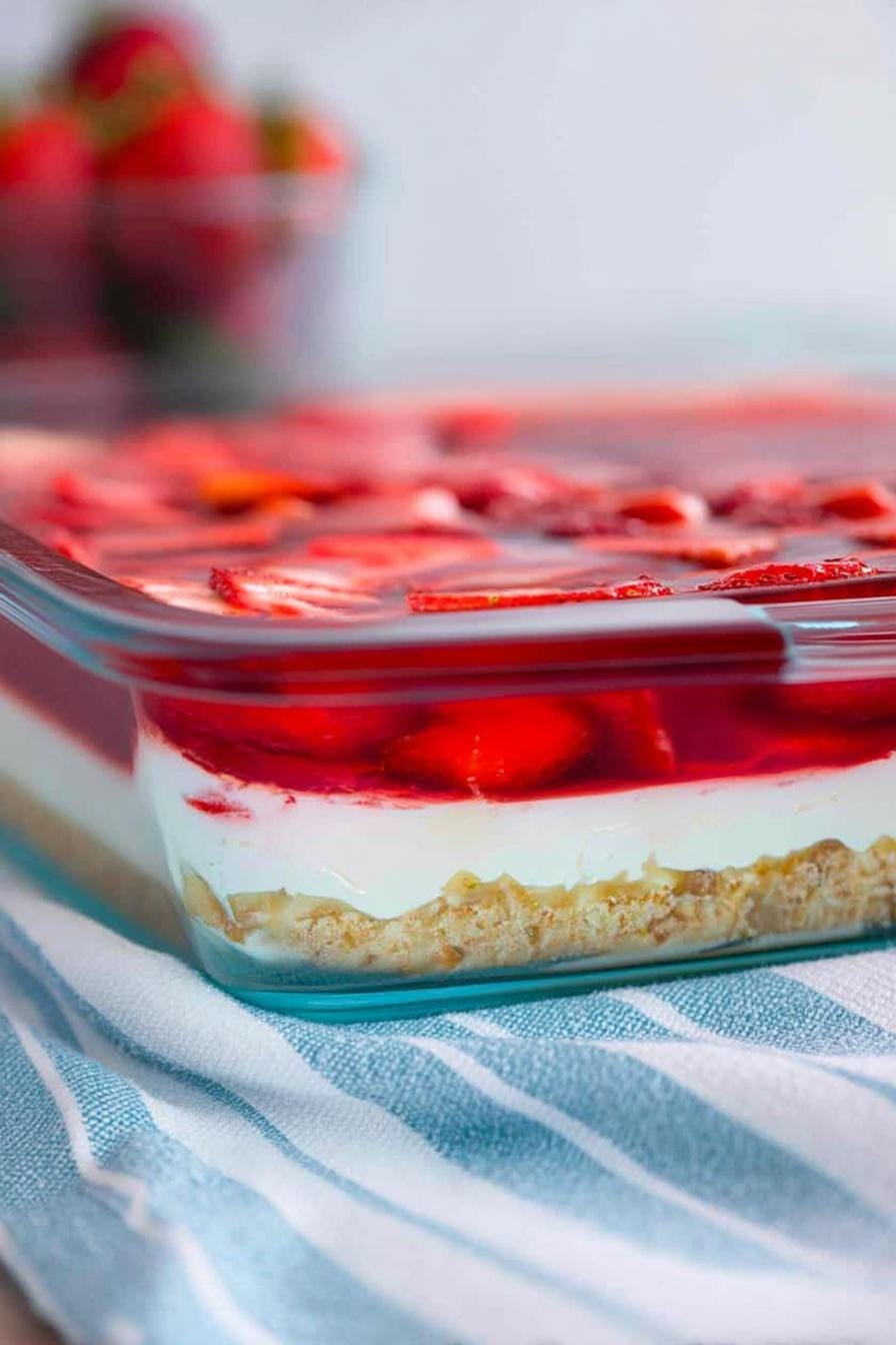 - Pour the strawberry mixture evenly atop the cream layer. Return to the refrigerator and let it set at least 4 hours or overnight. You’ll see a glossy red surface with soft bubbling around the edges when it’s ready to slice.