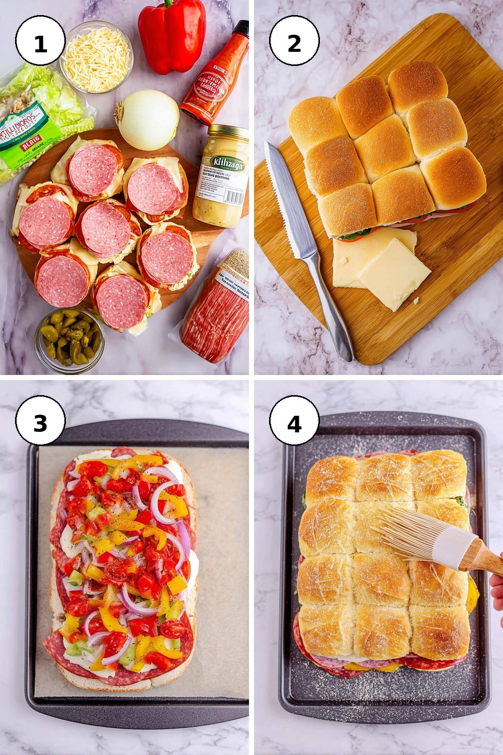 - Start layering: first the ham, then the salami, and finish with pepperoni. Add a layer of provolone cheese, sprinkle Italian seasoning, top with chopped tomatoes, red onions, and pepperoncini peppers. Place the top buns back on.