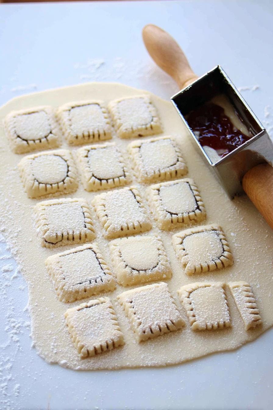 - Roll out the chilled dough, cut into squares, and fill each with fruit preserves.
