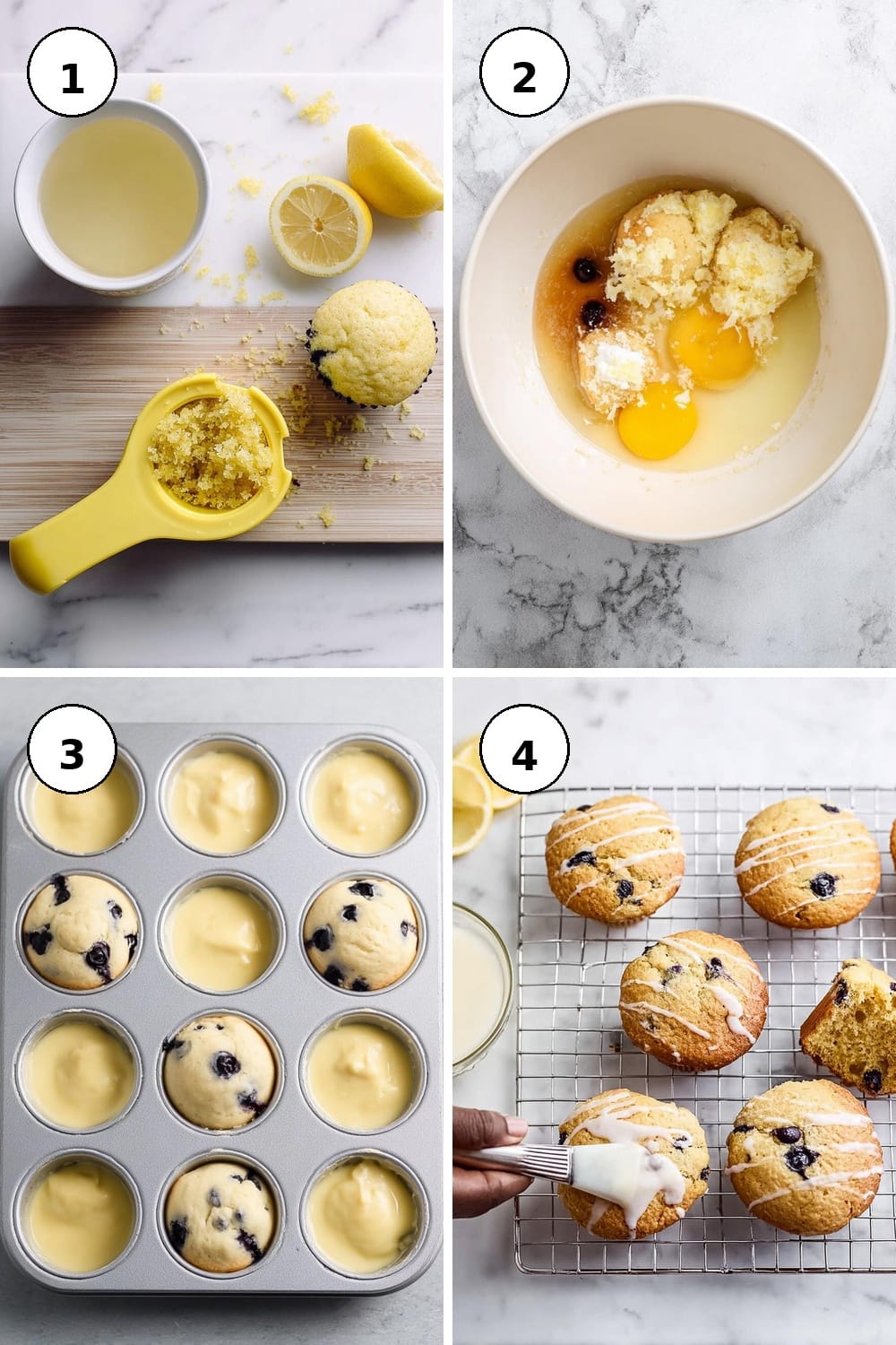 - For a finishing touch, mix the powdered sugar, lemon juice, and zest in a small bowl and drizzle over the cooled muffins.