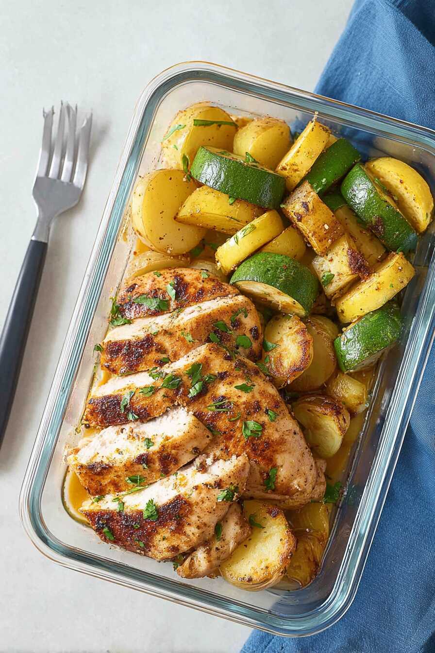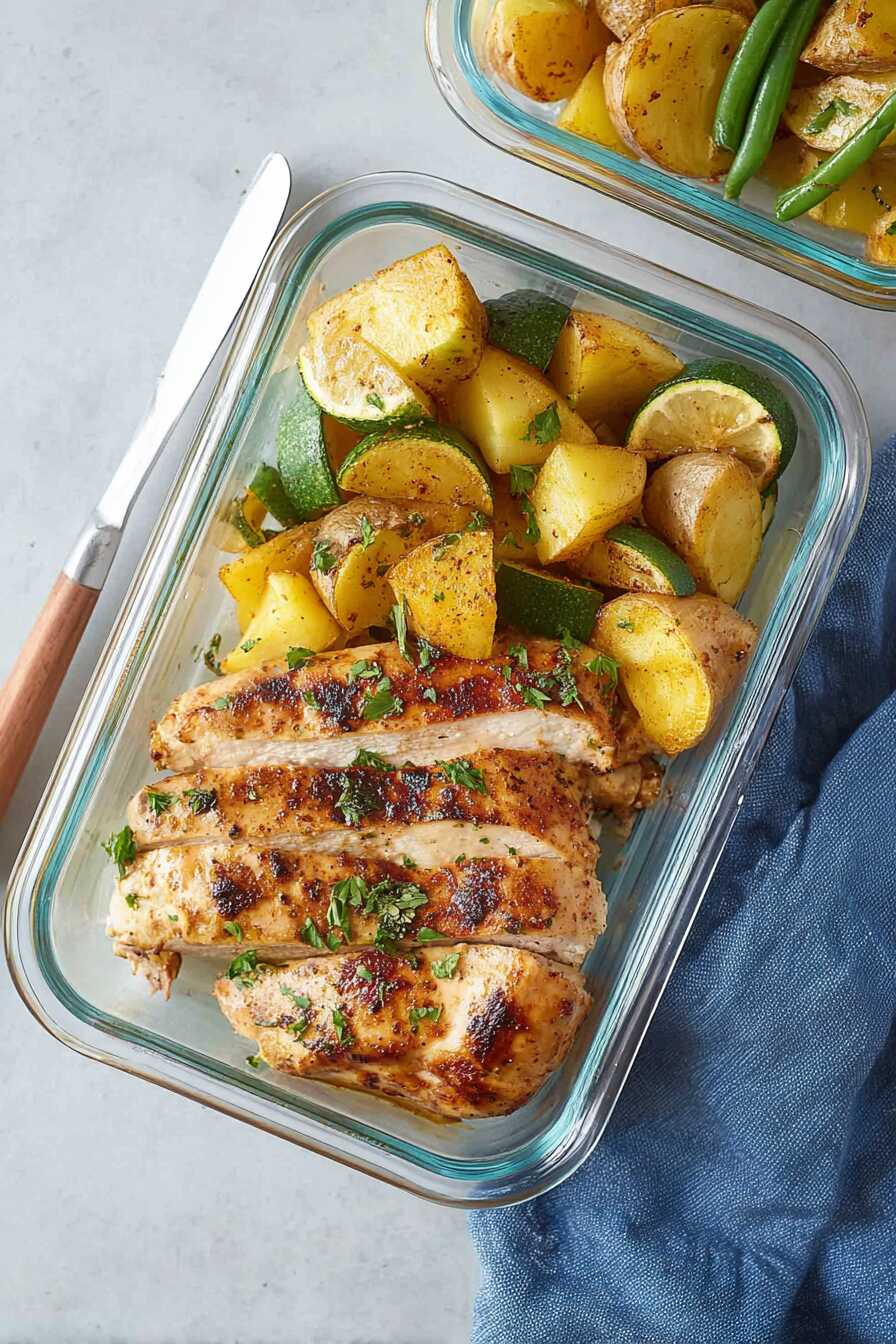 - Arrange sliced chicken, zucchini, and potatoes in meal prep containers. Enjoy convenient meals throughout the week!
