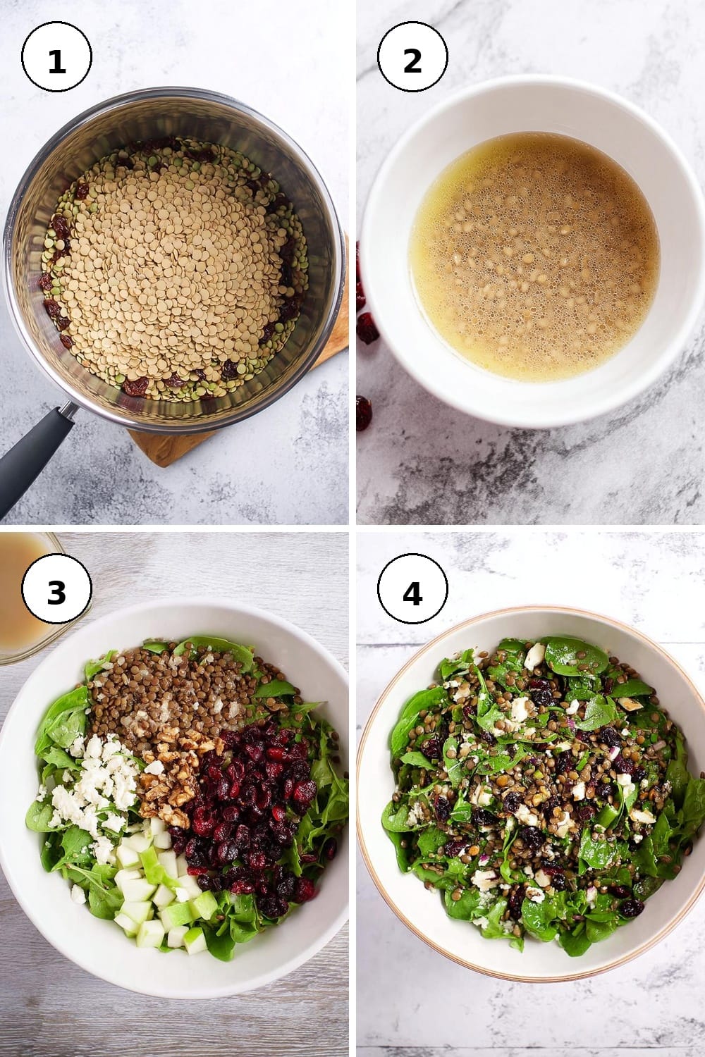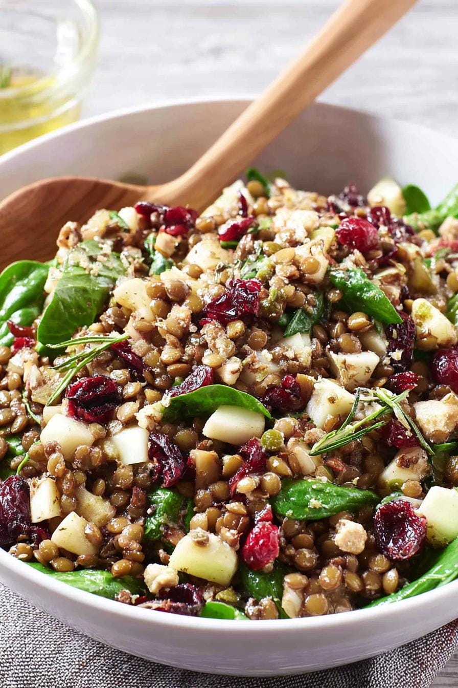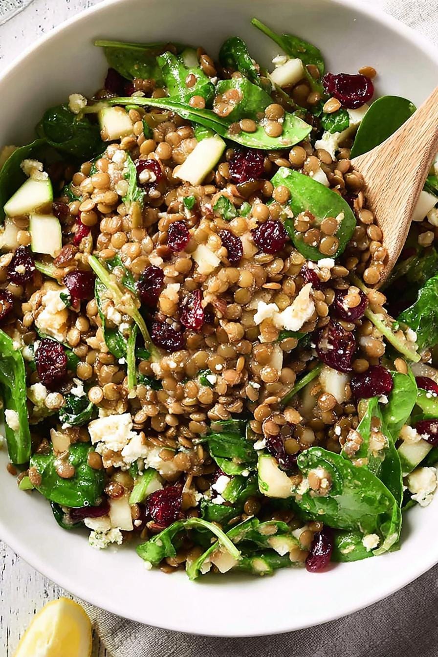 - When the lentils are done, drain and rinse them under cold water to stop the cooking process. In a large bowl, combine the lentils, fresh spinach, cranberries, diced apple, feta, and walnuts, gently folding to mix.