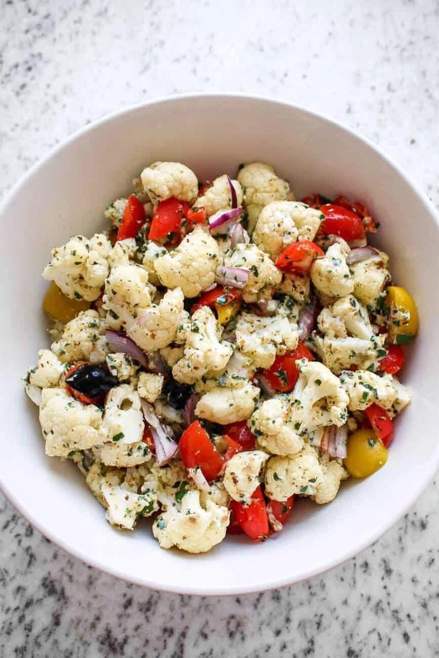 Enjoy this Marinated Cauliflower Salad as a refreshing side to grilled meats or alongside a refreshing Greek Salad. Pair with crusty bread for a light meal.