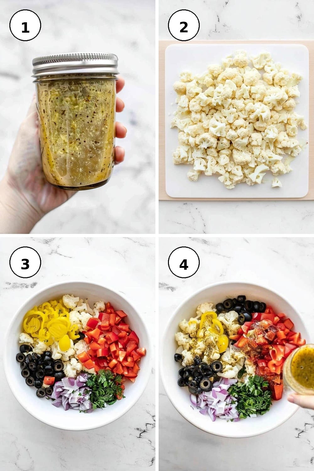 - Start by preparing the dressing. In a jar, combing ½ cup olive oil, ¼ cup red wine vinegar, 1 tsp Dijon mustard, ¼ tsp garlic powder, 1 Tbsp Italian seasoning, ½ tsp salt, and ¼ tsp freshly cracked black pepper. Shake well to combine and set aside.