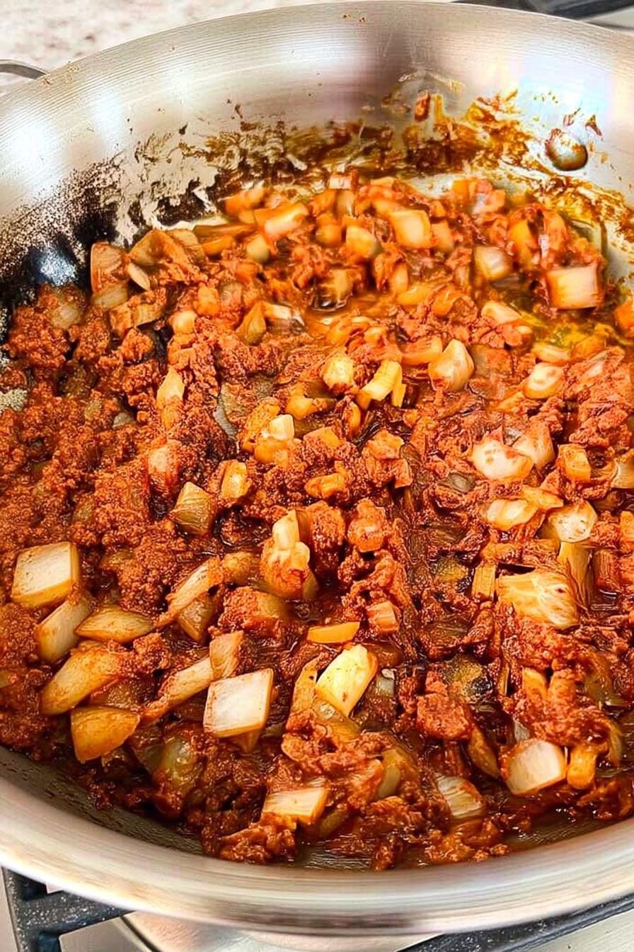 - In a large skillet over medium heat, add the chorizo and diced onions. Sauté them until the onions are soft and the chorizo is browned, about 5 minutes.