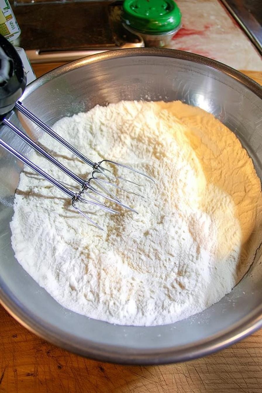 - In a mixing bowl, combine flour, sugar, and baking powder, whisking until evenly mixed.