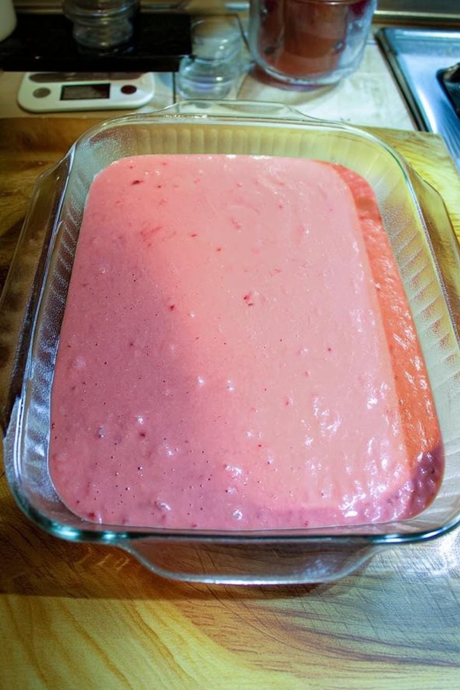 - Pour the batter into the prepared pan and sprinkle the remaining chopped strawberries on top.