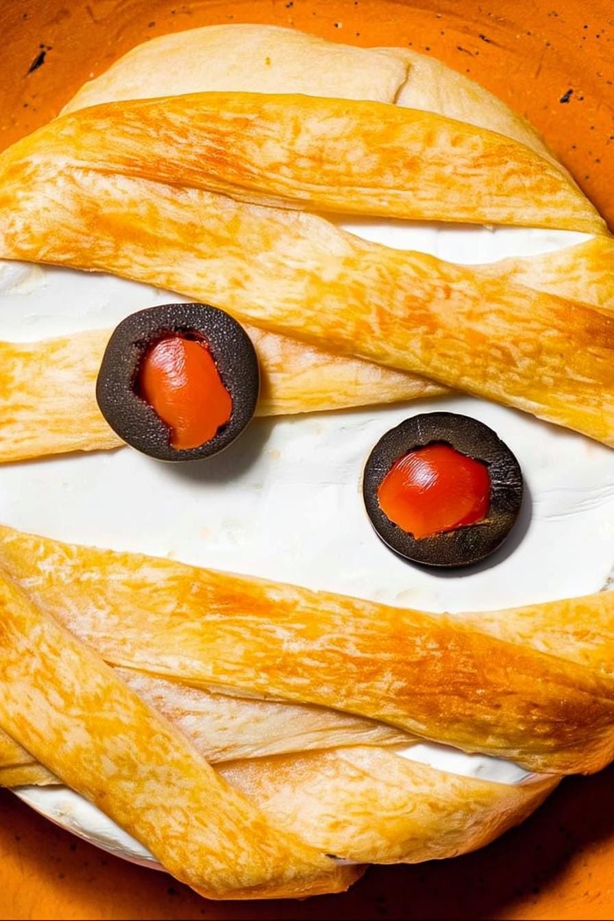 - Drape pastry strips across brie in a crisscross pattern, overlapping to mimic mummy wrappings.