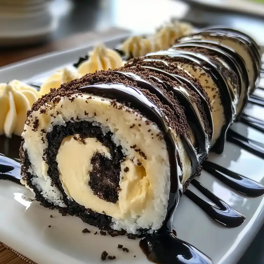 Spread the filling evenly over the chilled Oreo sheet. Starting from one edge, carefully roll it into a log using the parchment paper as a guide. Wrap in plastic and chill for at least 1 hour.
