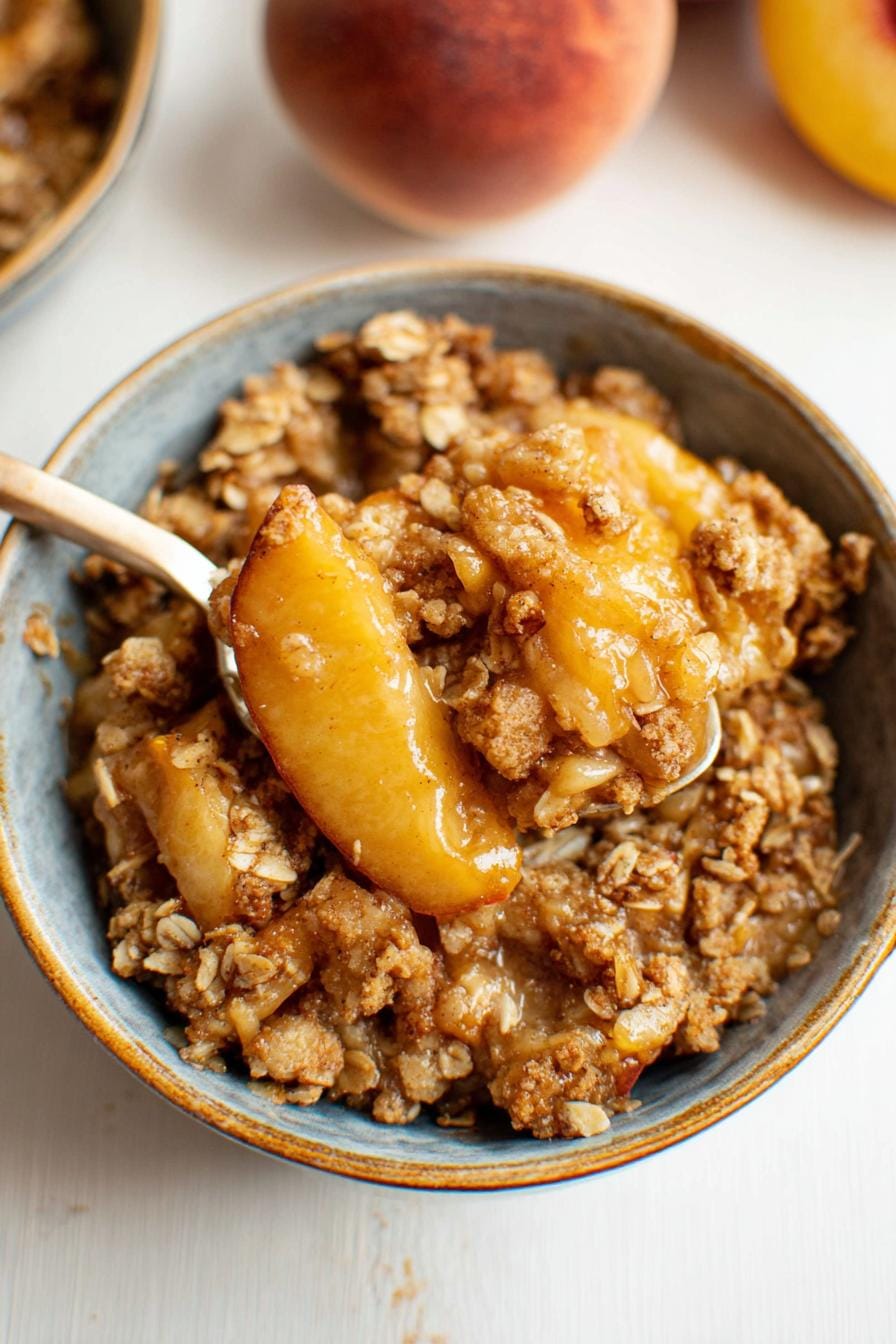 Golden oat topping over bubbling peach filling—simple, rustic, and impossibly comforting.