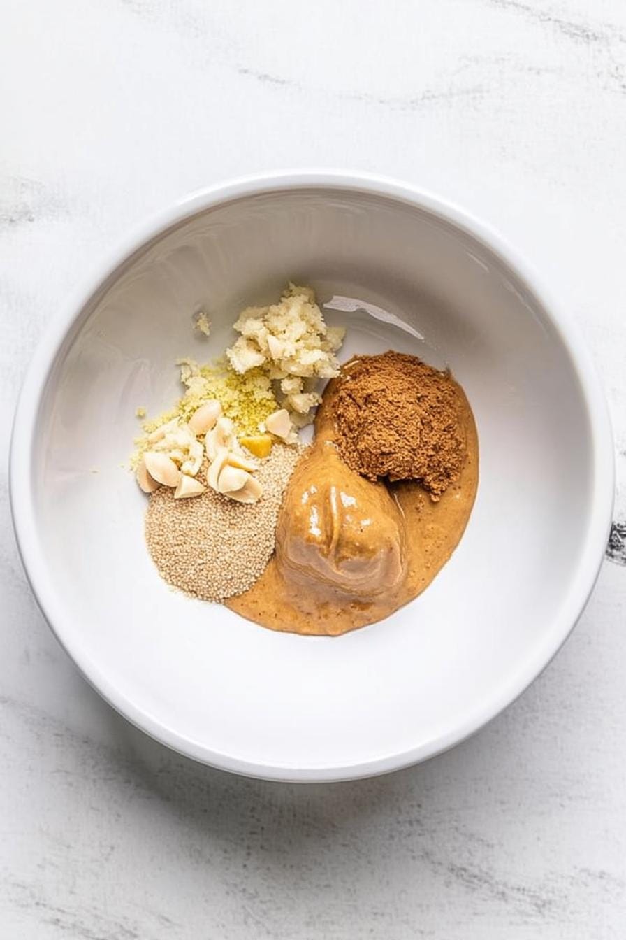 - In a bowl or blender, mix the peanut butter with brown sugar, minced garlic, and grated ginger.