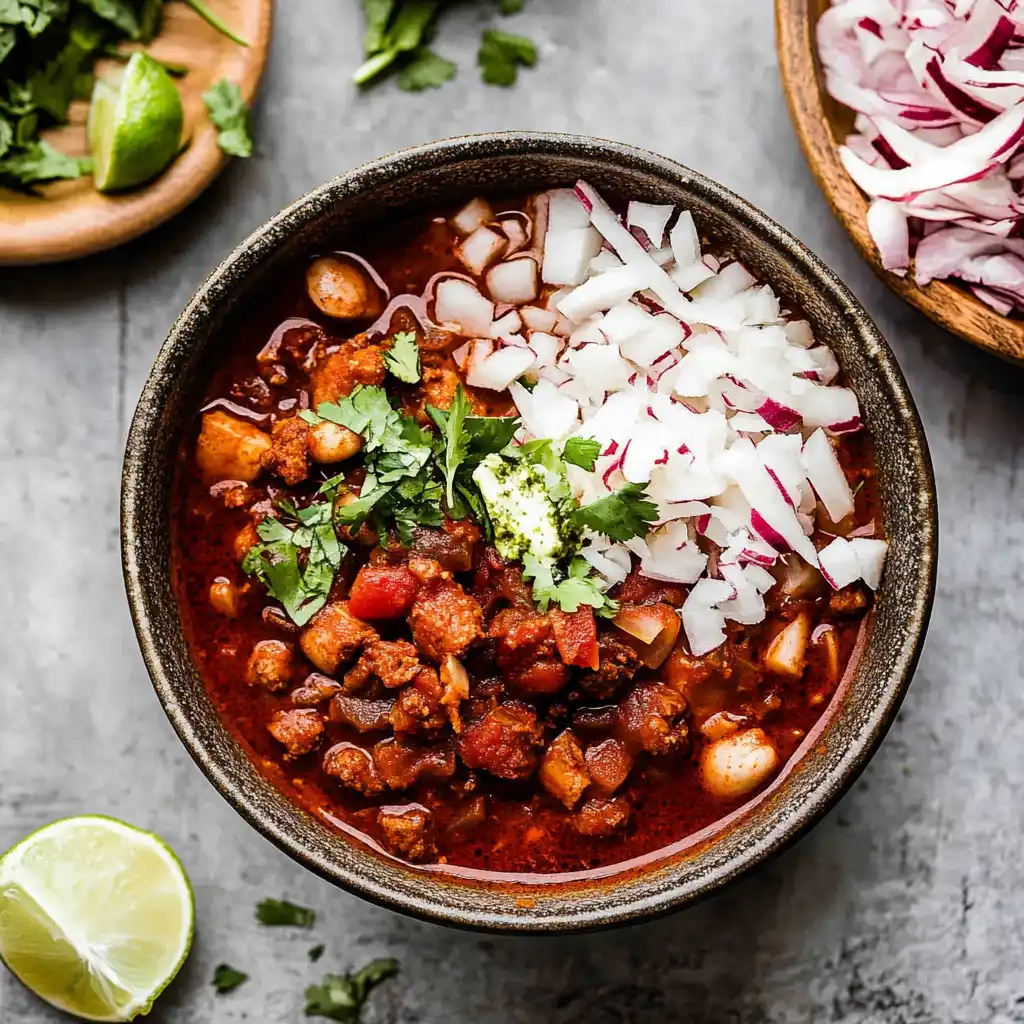 - Shredded Cabbage, Radishes, Lime, Cilantro – fresh toppings that balance the hearty stew.