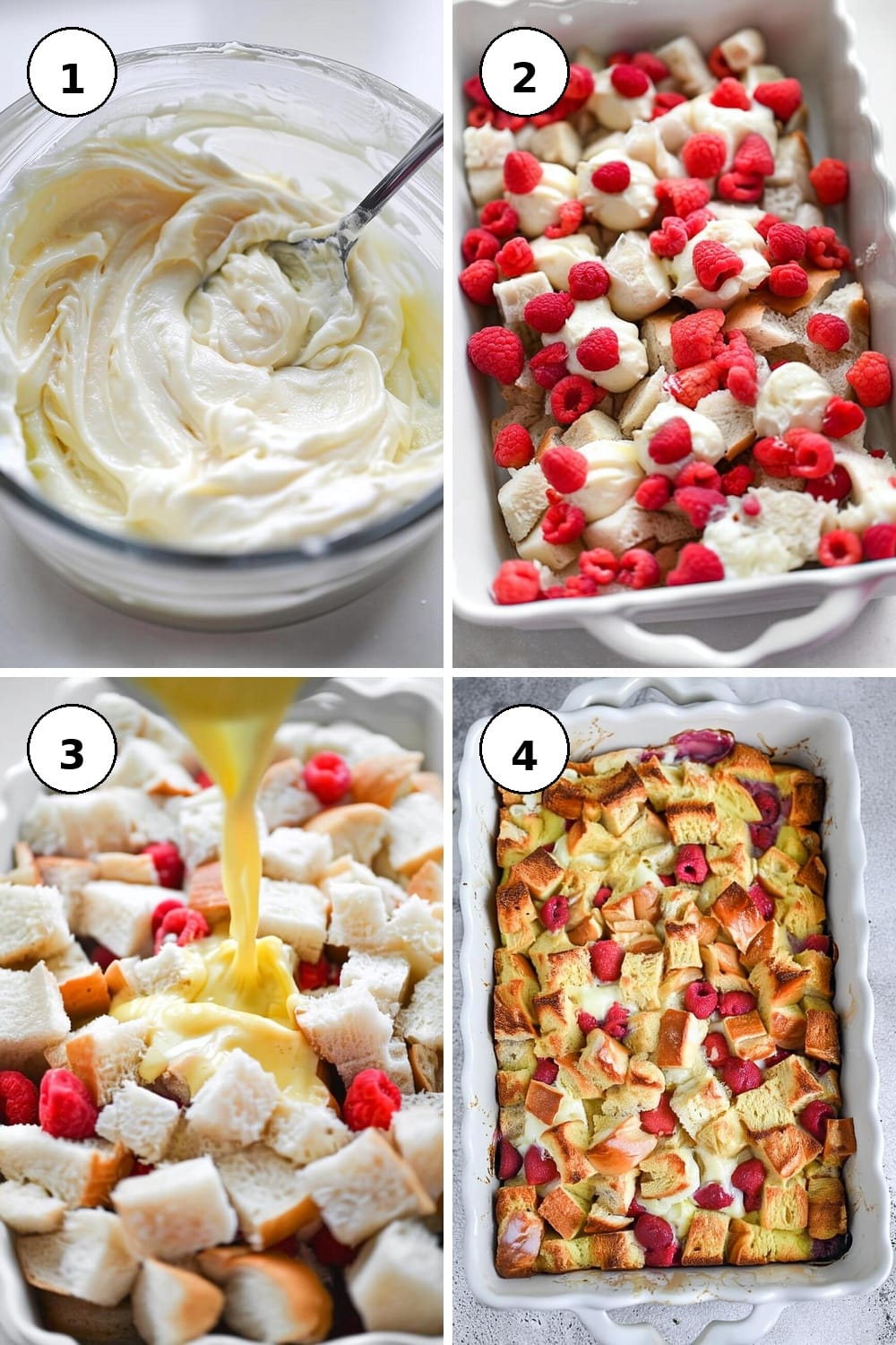 - Spread this cream cheese mixture over the layer of bread, followed by the raspberries, and finally add the remaining bread cubes for a layered effect.