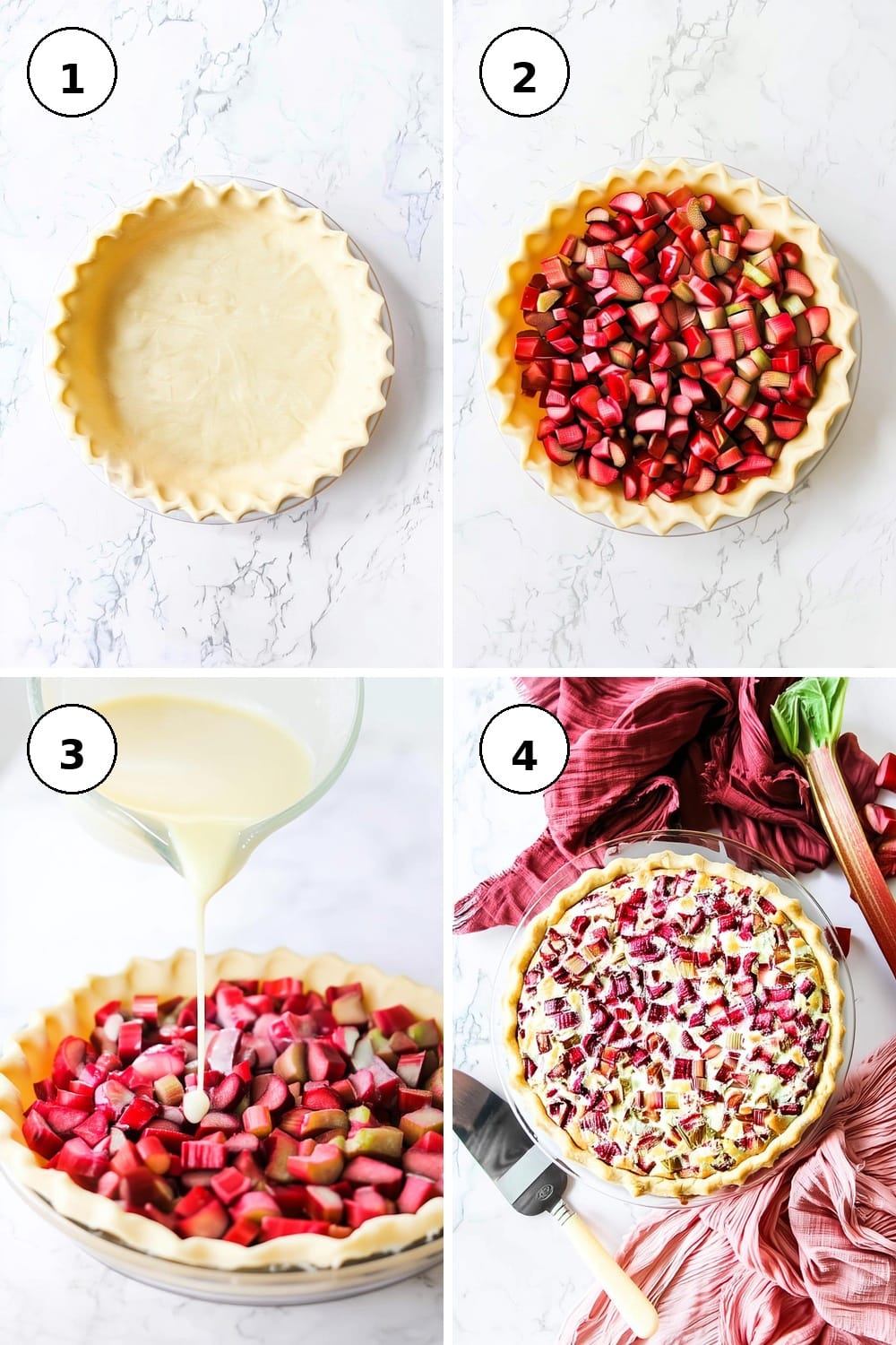 - In another bowl, toss 3 1/2 cups of chopped rhubarb with 1 1/2 cups of sugar, 3 tablespoons of flour, and 1/4 teaspoon of salt, ensuring each piece is well-coated. Spread evenly in the pie crust.