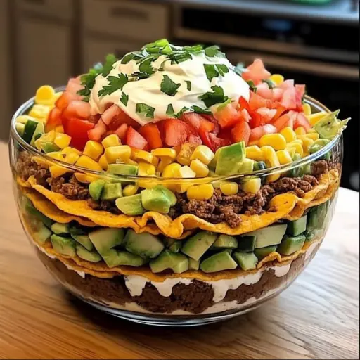 This Seven Layer Taco Salad is more than just a dish—it’s a party in a bowl! Whether you’re hosting game day, a backyard BBQ, or simply want to jazz up taco night, this recipe is sure to be a hit. Give it a try, customize it your way, and don’t forget to share your version on social media. Hungry for more? Check out our other crowd-pleasing recipes!
