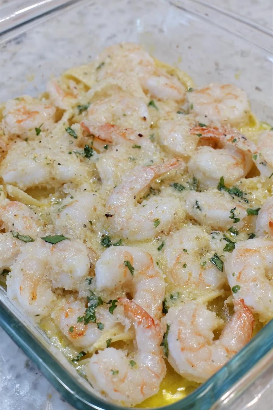 - In a large bowl, mix cooked pasta, shrimp, heavy cream, mozzarella cheese, red pepper flakes, salt, and pepper.