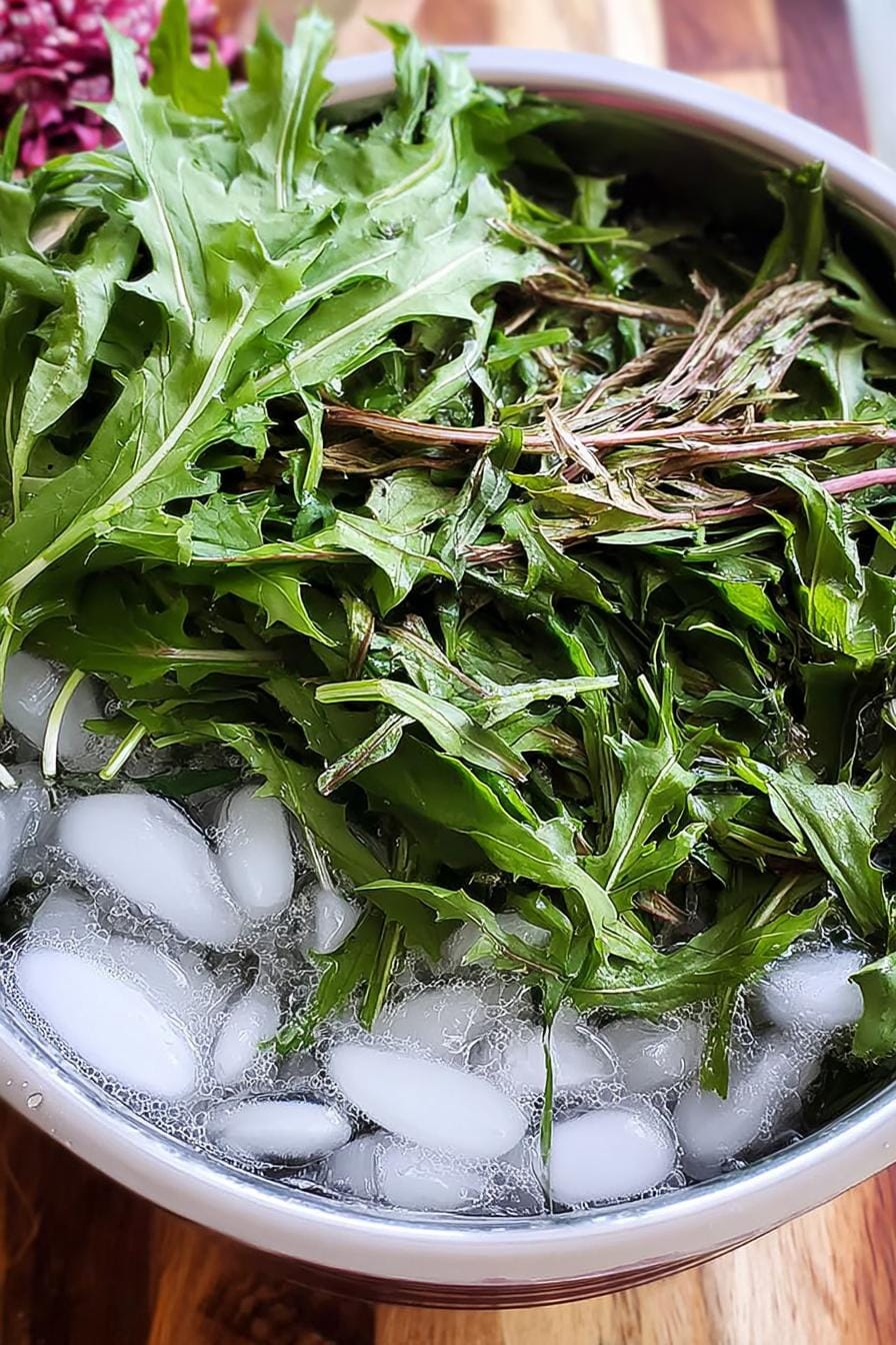 - Wash the dandelion greens and set them in a large bowl of ice water. Let them sit at least 15 minutes before proceeding. Move them to a colander to drain.