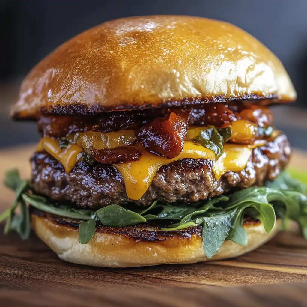 - Assemble the burger – Layer patties, caramelized onions, greens, and sauce between toasted buns.