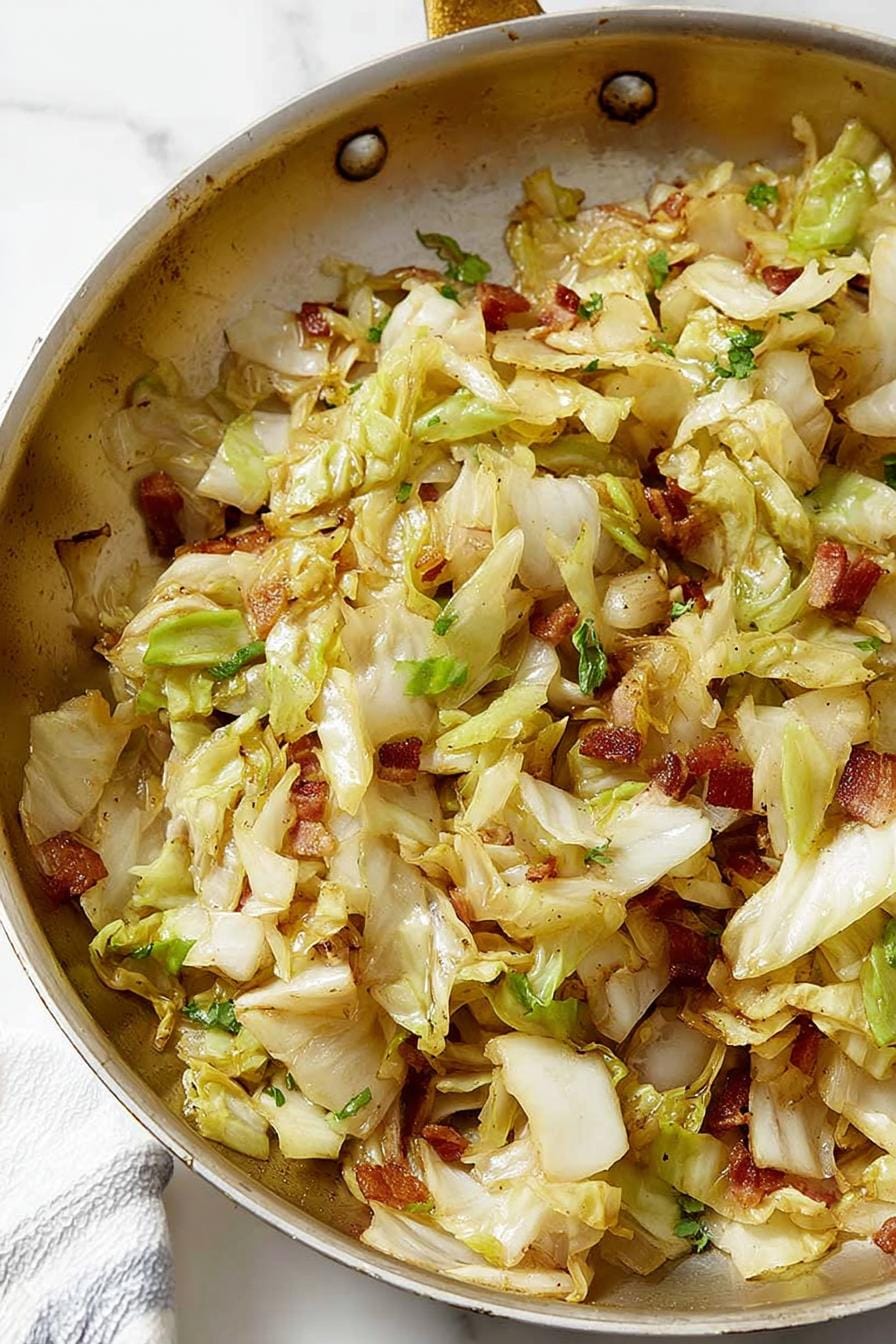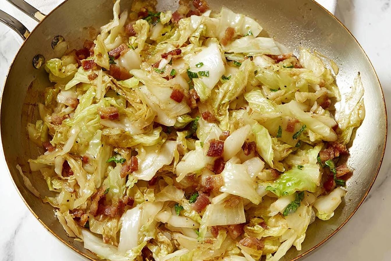 - Finally, crumble the cooked bacon and stir it back into the cabbage. Give the cabbage a taste and adjust to your liking. Garnish with some freshly cracked pepper, serve, and enjoy!