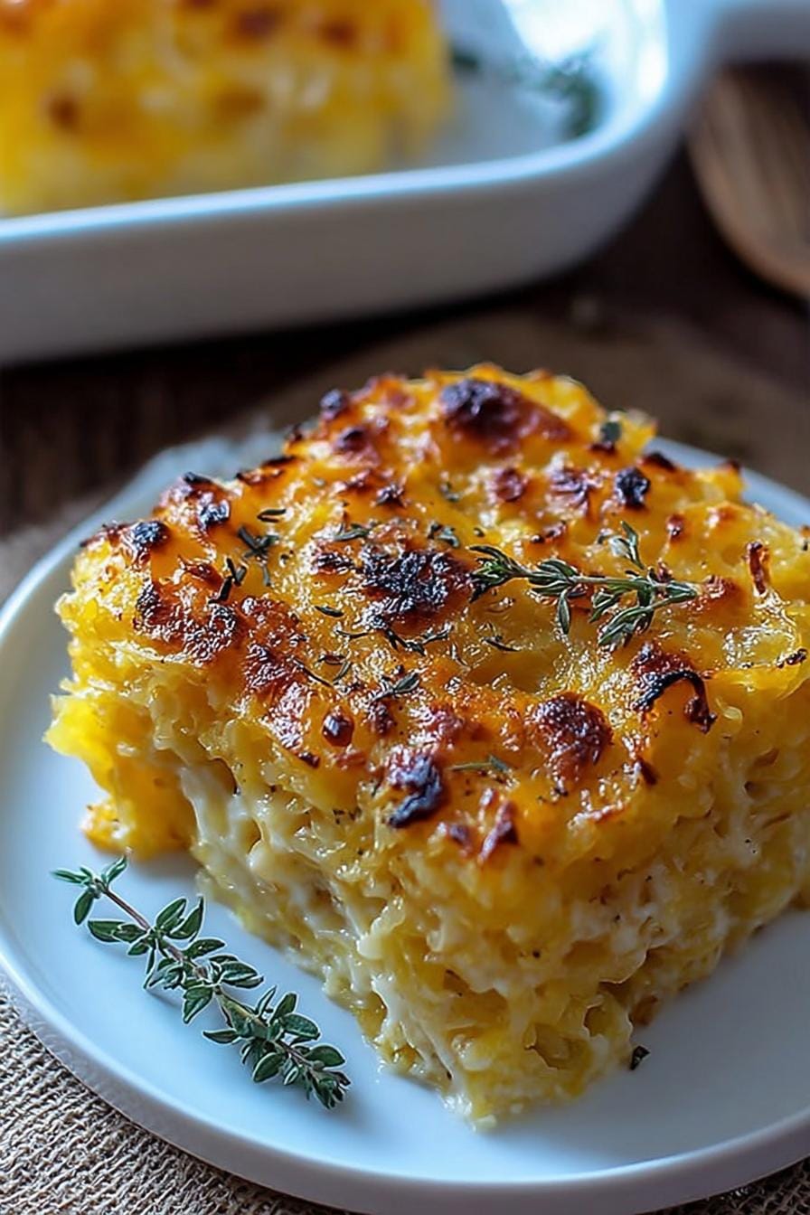 Spaghetti Squash Au Gratin: tender strands coated in a rich cheese sauce with a golden breadcrumb crust.