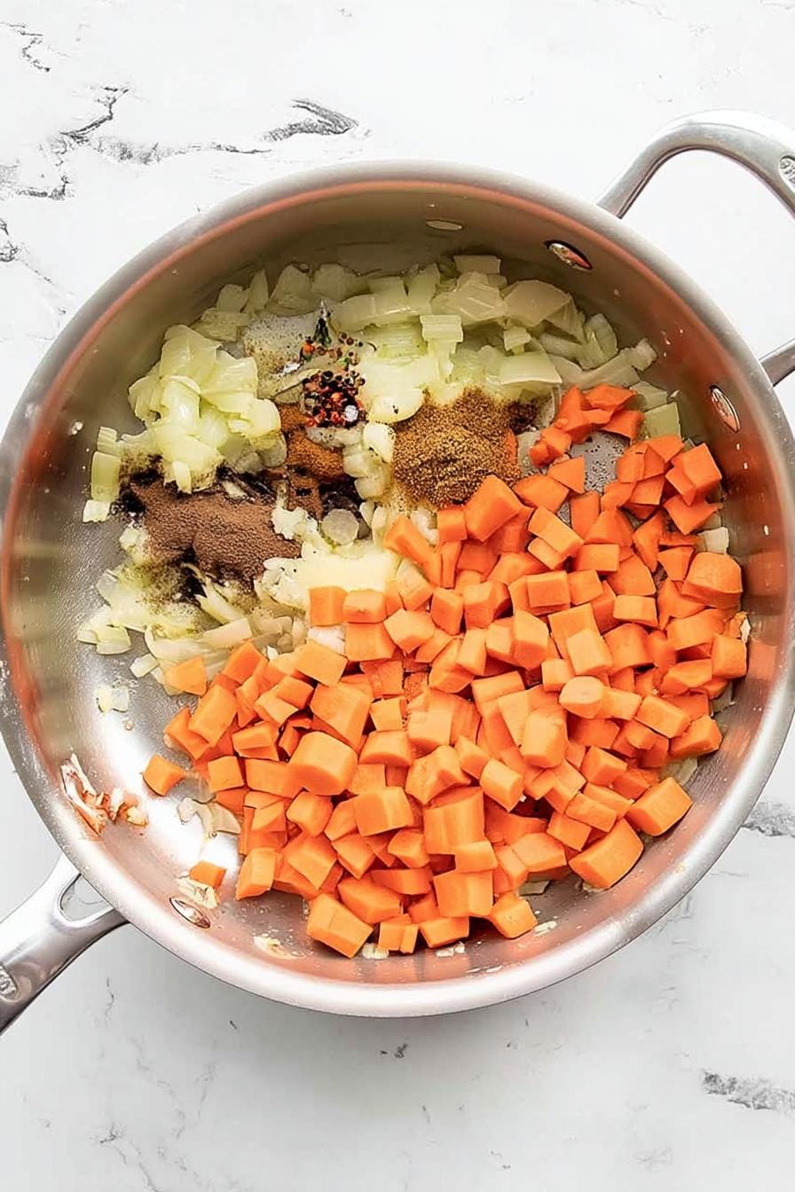 - Add the diced carrots, cumin, cinnamon, allspice, and crushed red pepper to the skillet. Continue to sauté for about two minutes more.