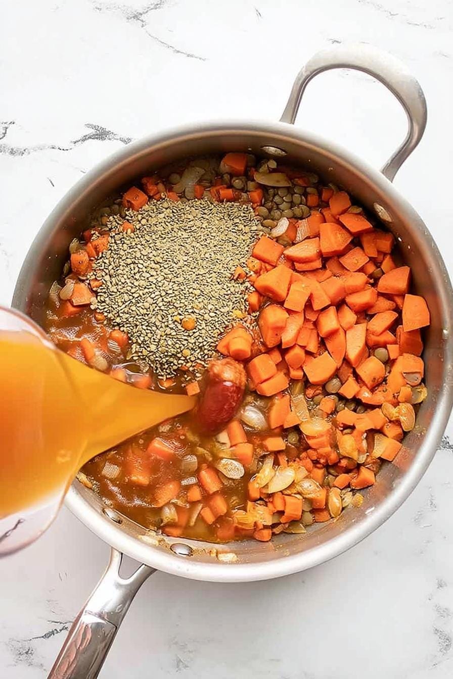 - Stir in the uncooked lentils, tomato paste, dried apricots (or raisins), and vegetable broth. Ensure the tomato paste dissolves fully. Cover the skillet and increase heat to high until it reaches a boil.