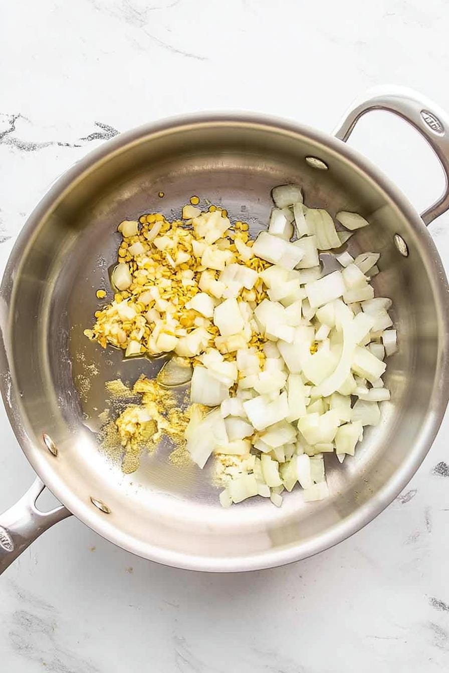 - Add the onion, garlic, ginger, and olive oil to a deep skillet. Sauté over medium heat until the onions are soft and translucent (about five minutes).