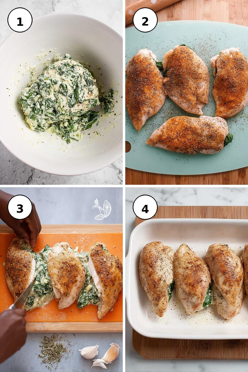 - Rub olive oil on each breast, then evenly apply the spice mixture on both sides before filling with the spinach mixture.