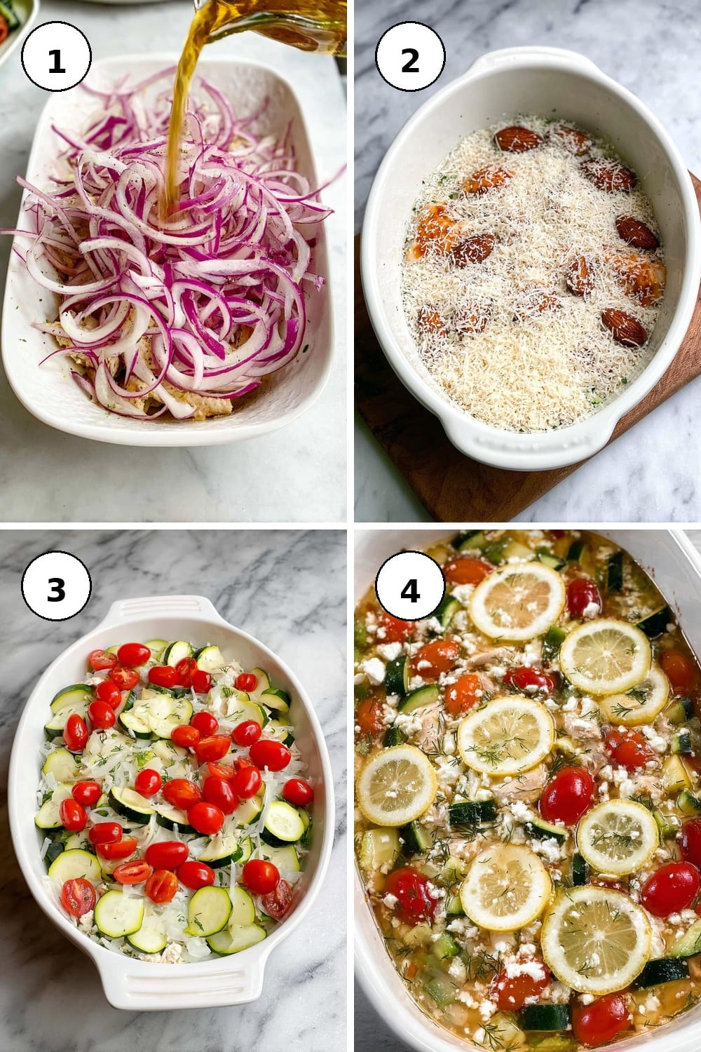 - Preheat your oven to 350°F (175°C). In a large baking dish, combine the diced chicken, zucchini, onion, grape tomatoes, and uncooked basmati rice.