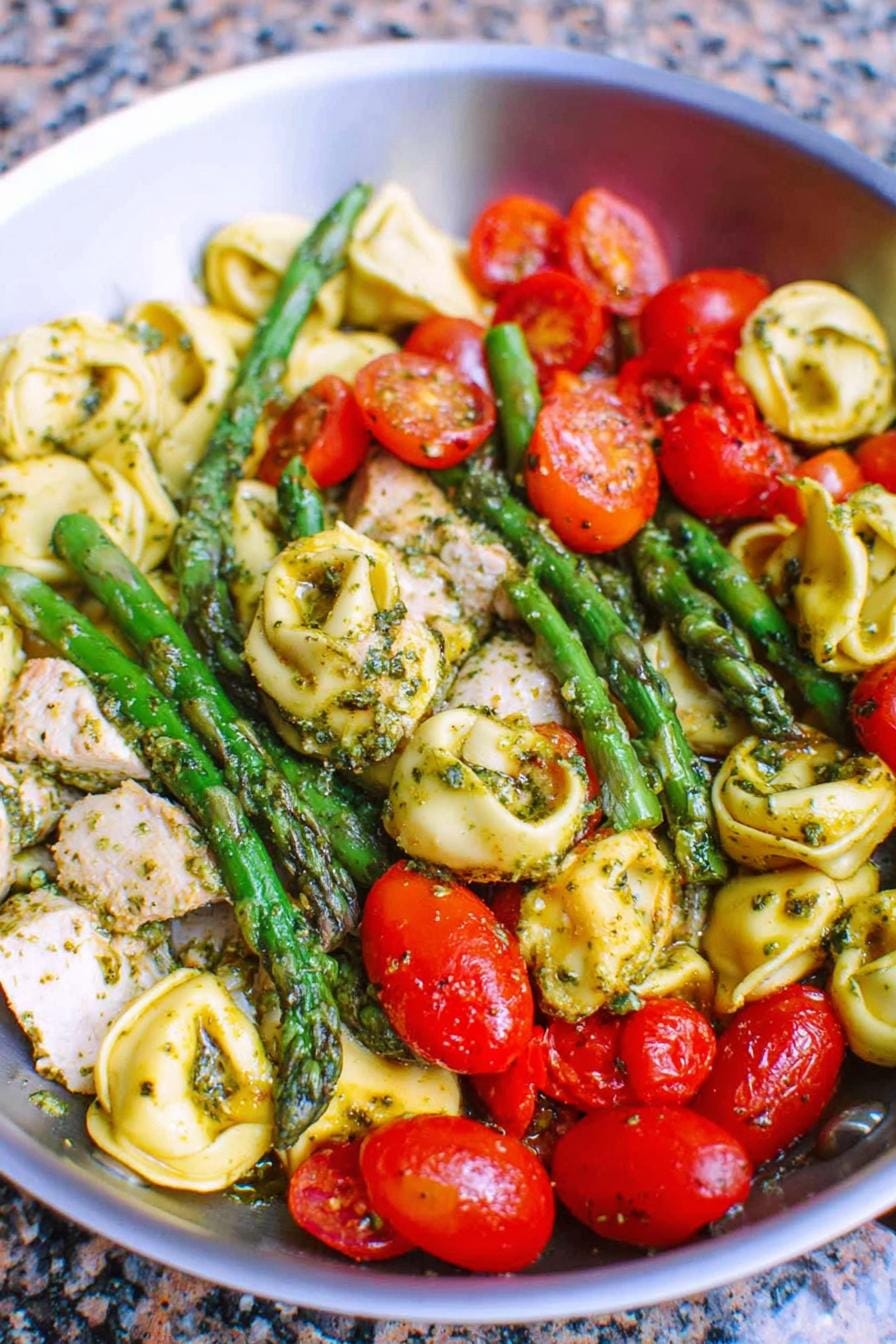 - Serve the chicken, tortellini, and cherry tomatoes atop the asparagus for a vibrant presentation.