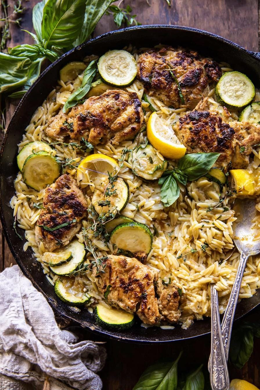 About Spring Skillet Garlic Butter Chicken and Zucchini Orzo.