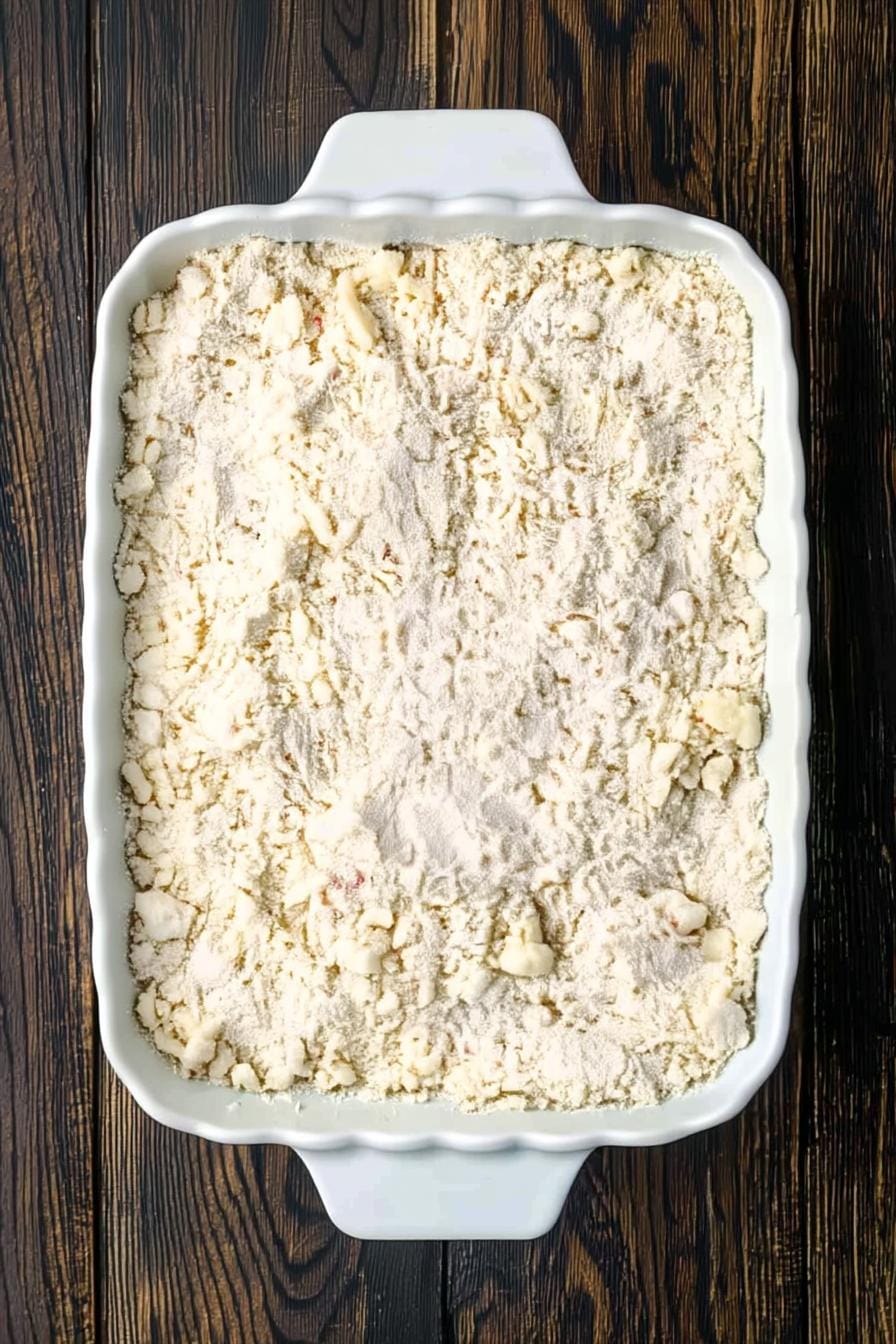 - In another bowl, mix flour, softened butter, and a pinch of salt until crumbly. Pour this mixture evenly over the strawberries.