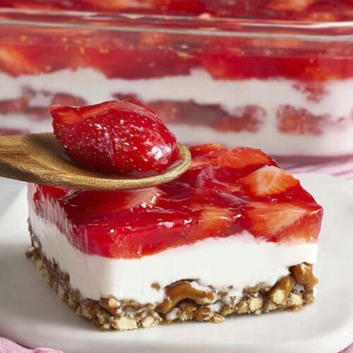 This Strawberry Pretzel Salad can be safely stored in the refrigerator for up to 3 days. If you decide to freeze it, enjoy it within a month for optimal freshness. Reheating isn’t applicable—simply enjoy it cold! I found that it maintains its texture well for a couple of days, but the pretzel crust may soften if left too long.