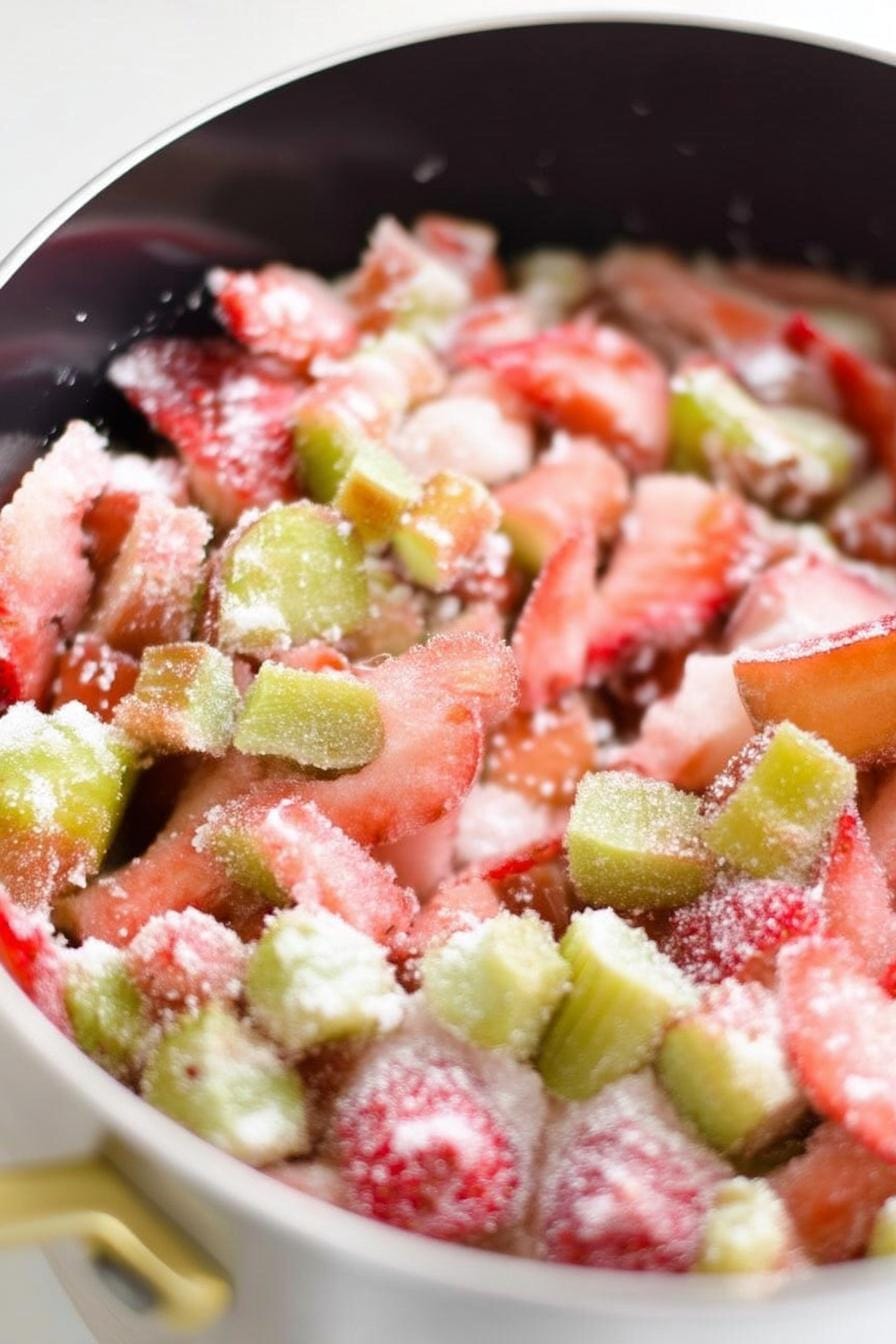 - In a large saucepan, combine the diced rhubarb, strawberries, and sugar. Stir to mix well and let it sit for about 10 minutes to release some juices.