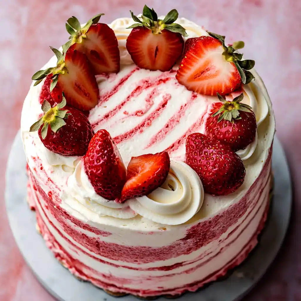 - Frost and decorate – Cover the cake with whipped cream, swirl strawberry purée or jam for a marbled effect, and top with fresh strawberry halves.