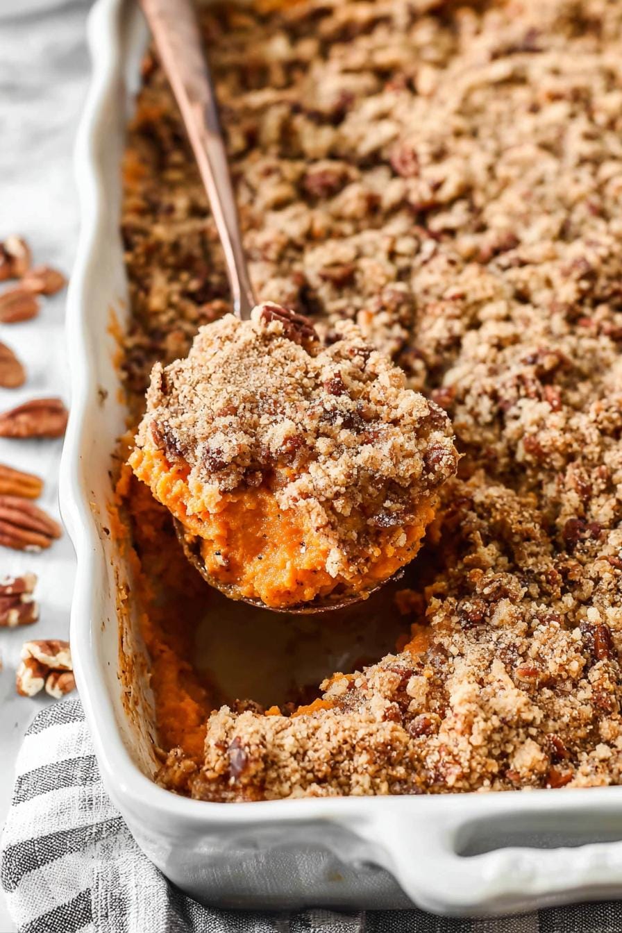 - Sprinkle the pecan topping evenly over the sweet potatoes.