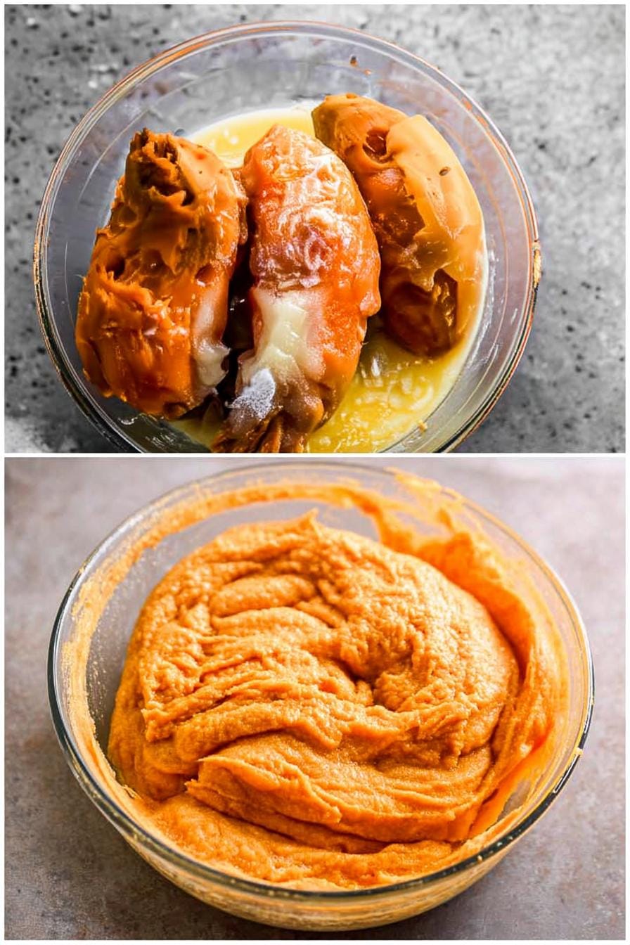 - Add ½ cup melted butter, ½ cup milk, ½ cup packed light brown sugar, 2 beaten eggs, 1 tsp vanilla extract, ½ tsp ground cinnamon, and ¼ tsp salt. Mash until the mixture is smooth and glossy.