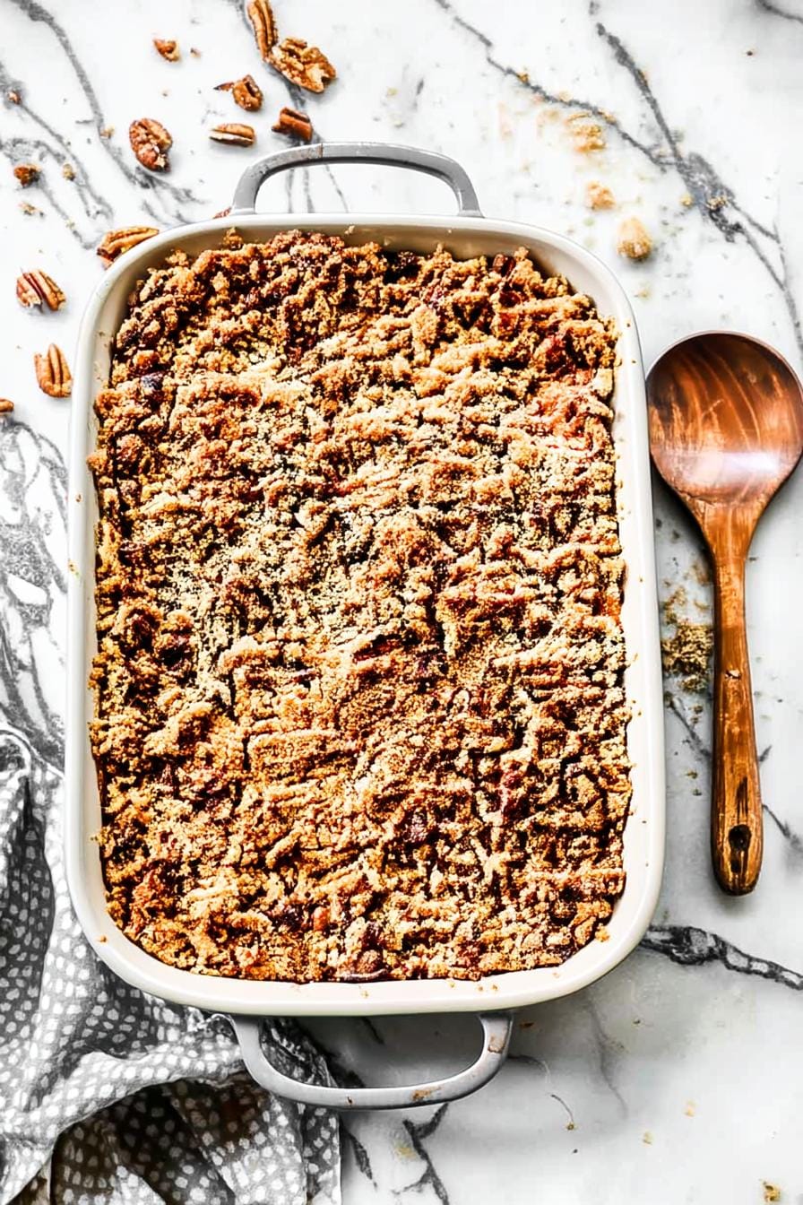 - What can I substitute for pecans in the topping? Walnuts or almonds work well; adjust to your preference and chop coarsely.
