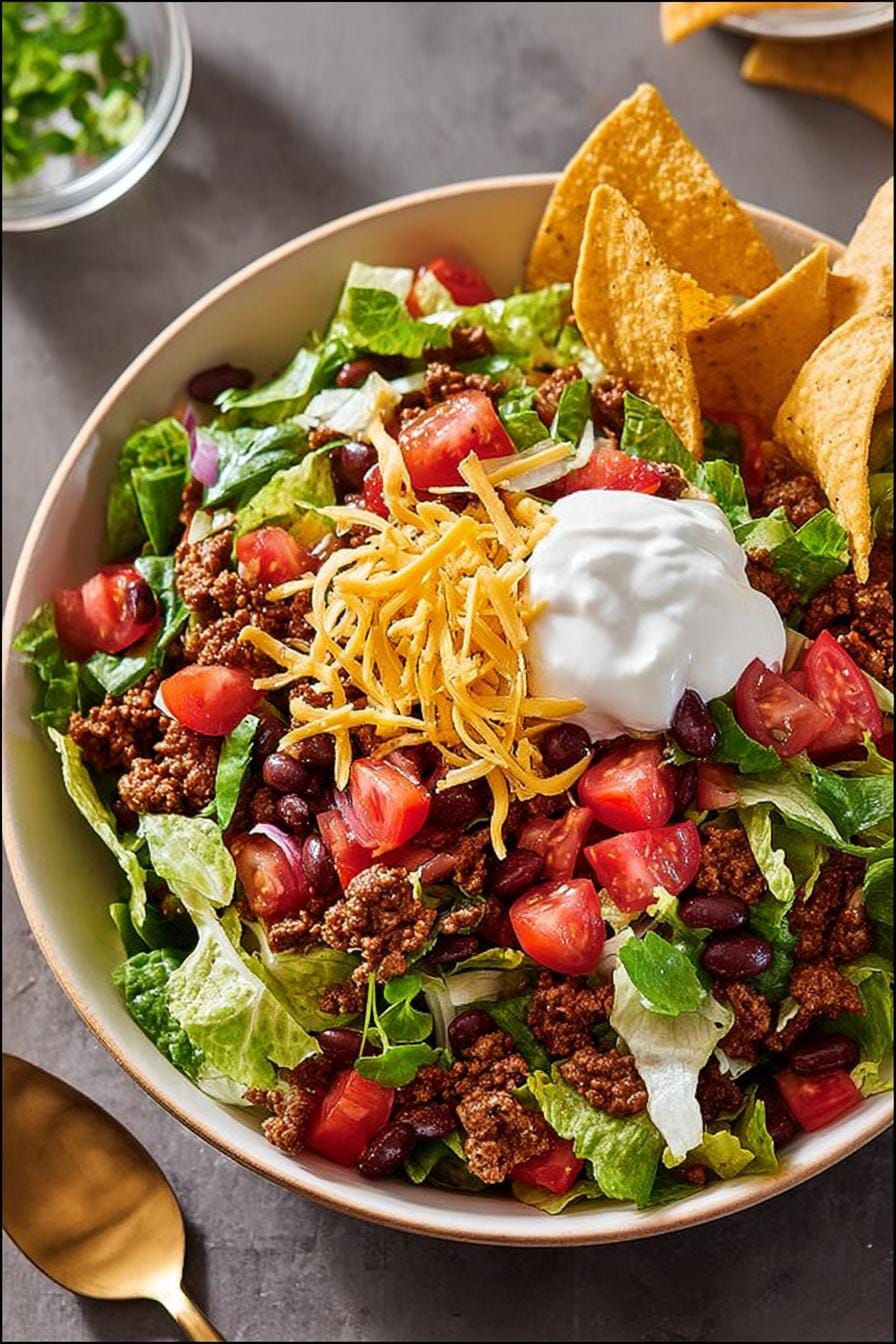 Taco salad is a Tex‑Mex classic that blends the best parts of a taco into a single bowl: seasoned meat, crunchy taco shells or chips, crisp greens and bright toppings. It became popular as an easy, shareable meal that showcases lively spices and contrasts — warm and cold, soft and crunchy. This version keeps things simple and approachable while highlighting the familiar flavors you expect from a weekday favorite.