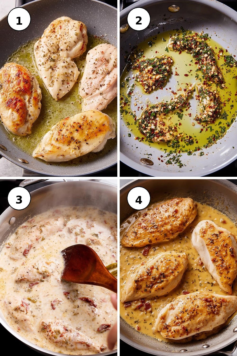 - Add low-sodium chicken broth, sun-dried tomatoes, heavy cream, and grated Parmesan. Season with salt. Bring mixture to a simmer before reinserting chicken with the accumulated juices into the skillet.