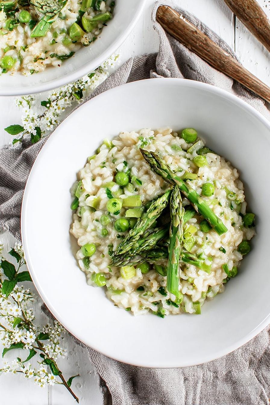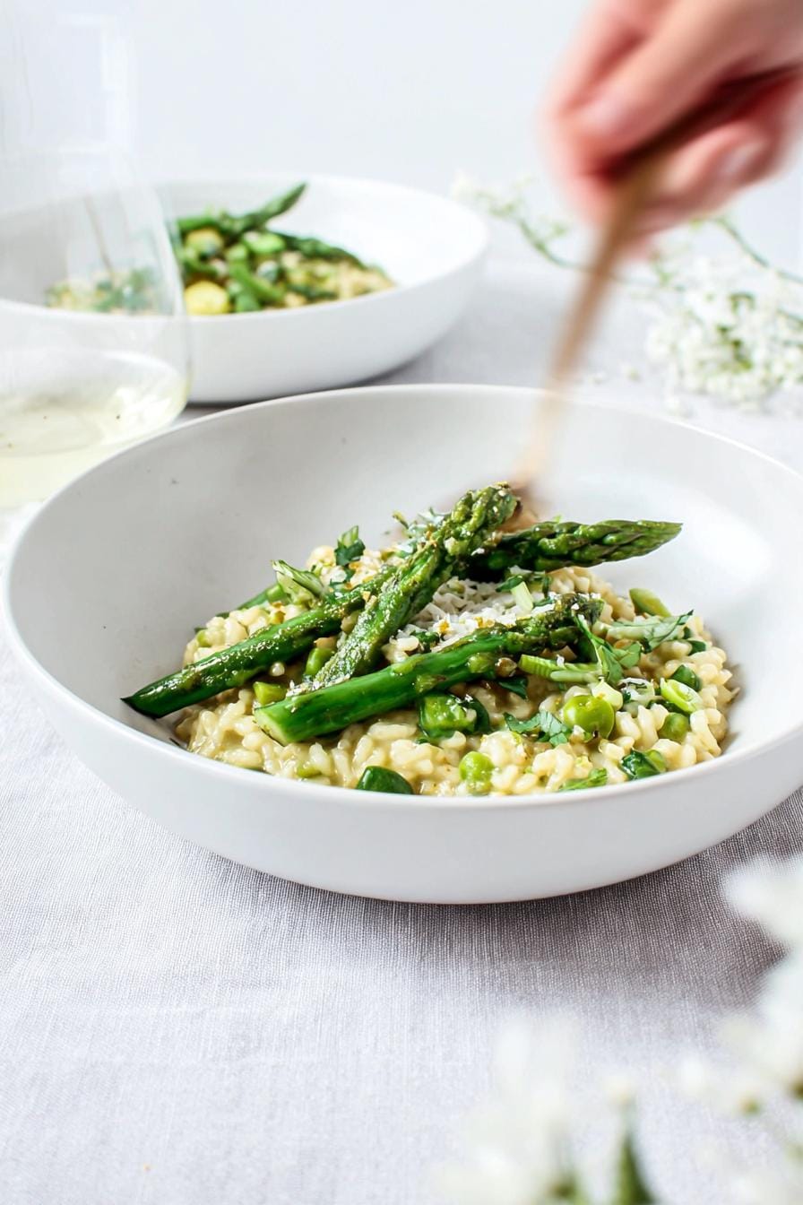 - Serve the creamy risotto topped with the reserved asparagus tips, a sprinkle of spring onions, and fresh herbs. A bit of lemon zest brightens everything up!