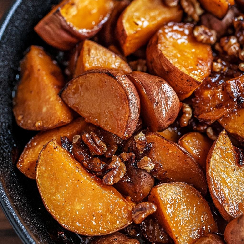Tender roasted sweet potatoes finished with a glossy maple glaze and a crunchy walnut topping—an easy, crowd-pleasing side that tastes like fall in every bite.