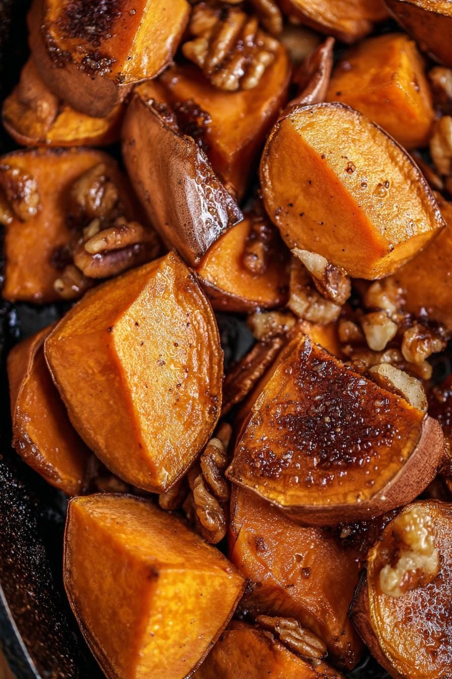 Remove from the oven, sprinkle the toasted walnuts over the glazed sweet potatoes, toss gently, adjust seasoning, and serve warm.